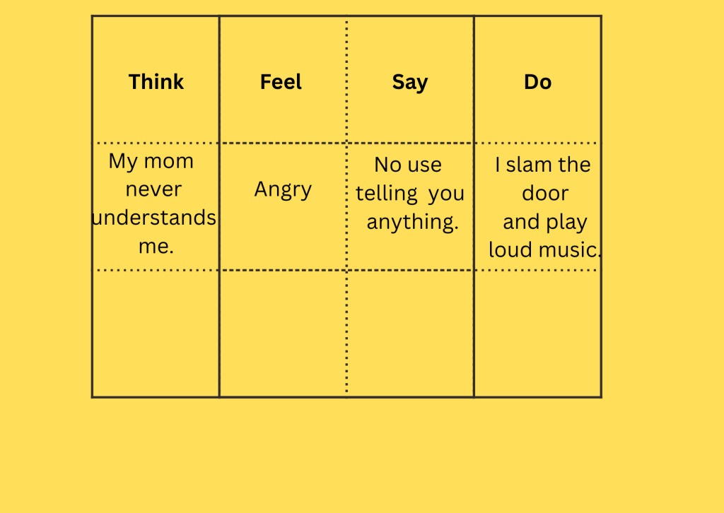 »In order to discuss emotions children may be shown the table to complete. Table with columns think, feel, say, do, as shown below. This can be adapted according to their ages. Younger ones can do with the help of emotion chart. older ones can do it through stories, pictures, characters, news. This makes them self aware and socially aware as well.